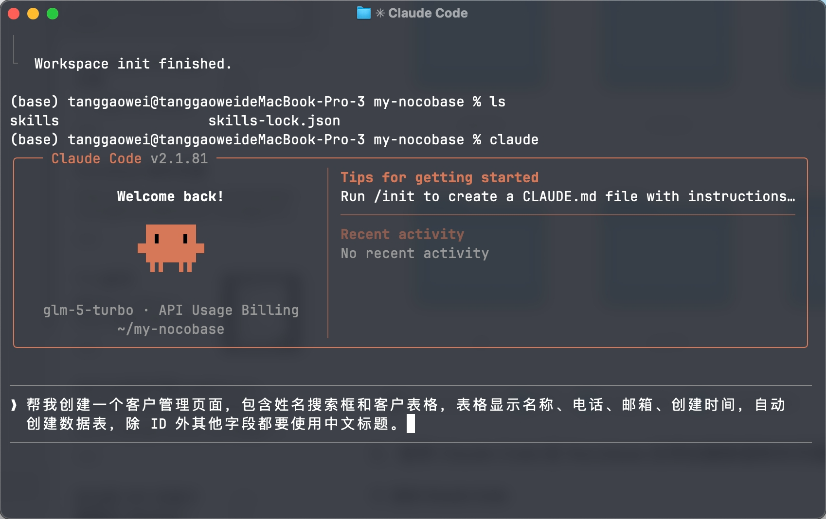 在前面创建的工作目录(例如 my-nocobase)下运行 claude 命令: