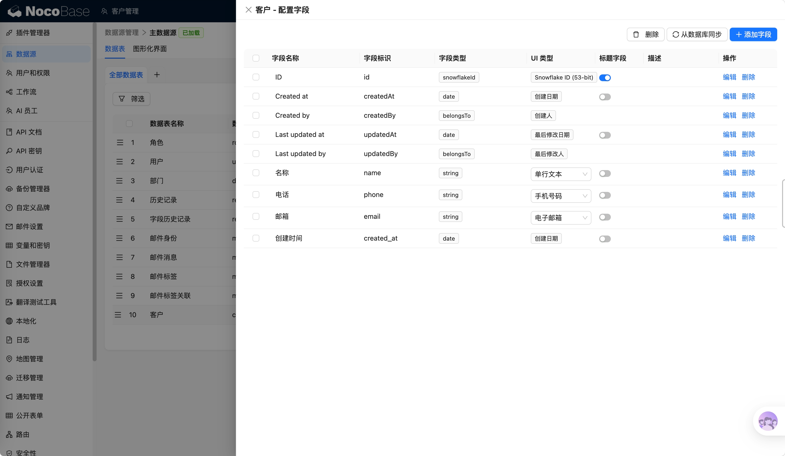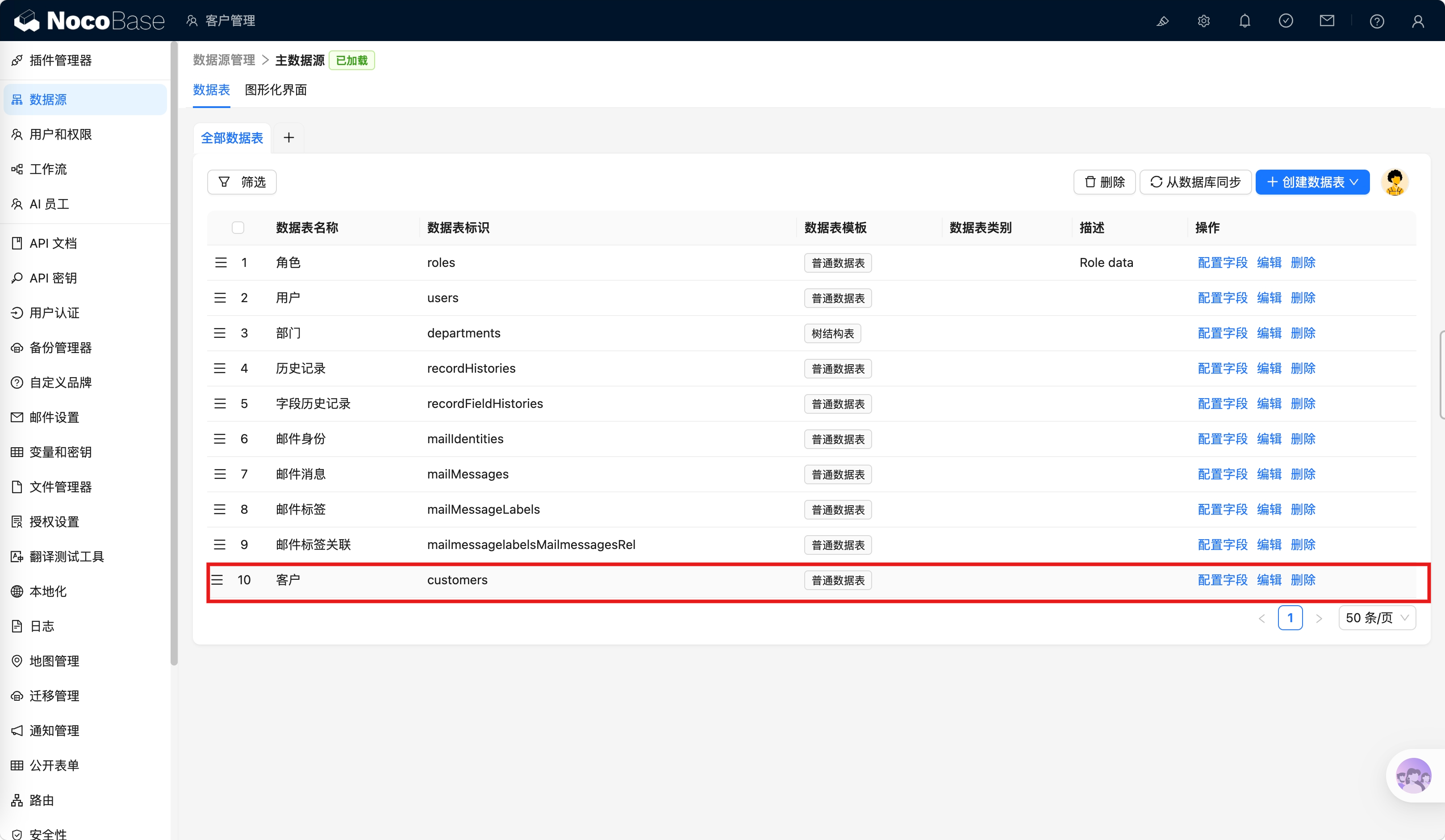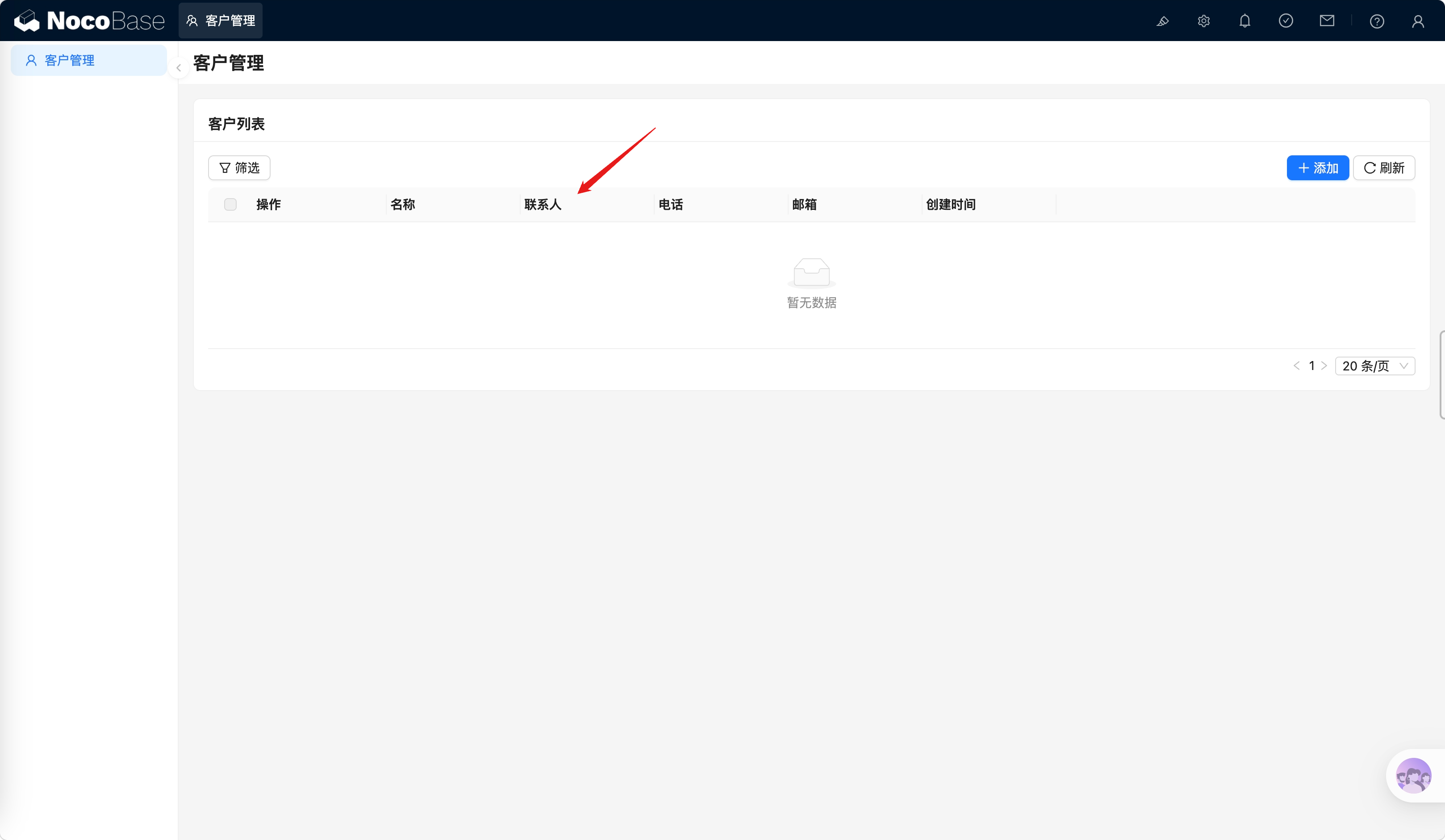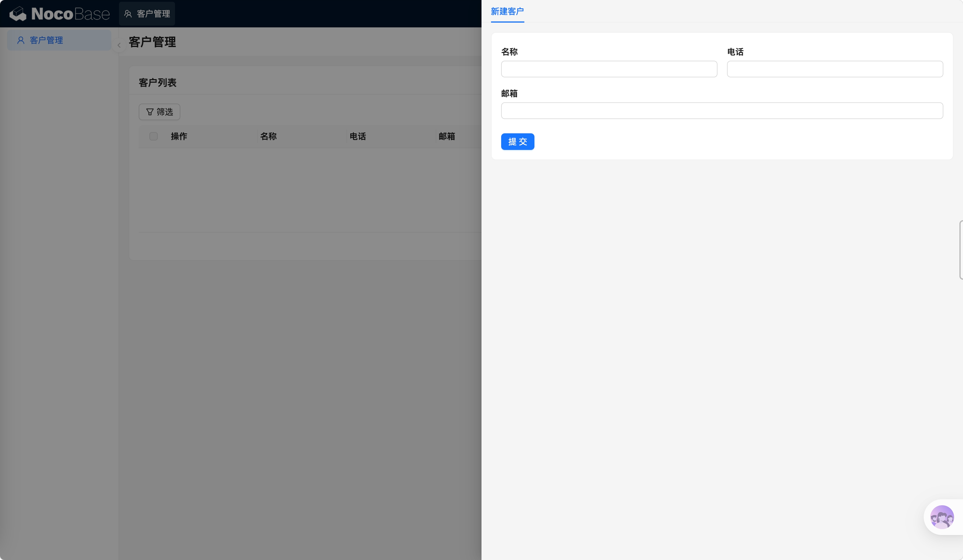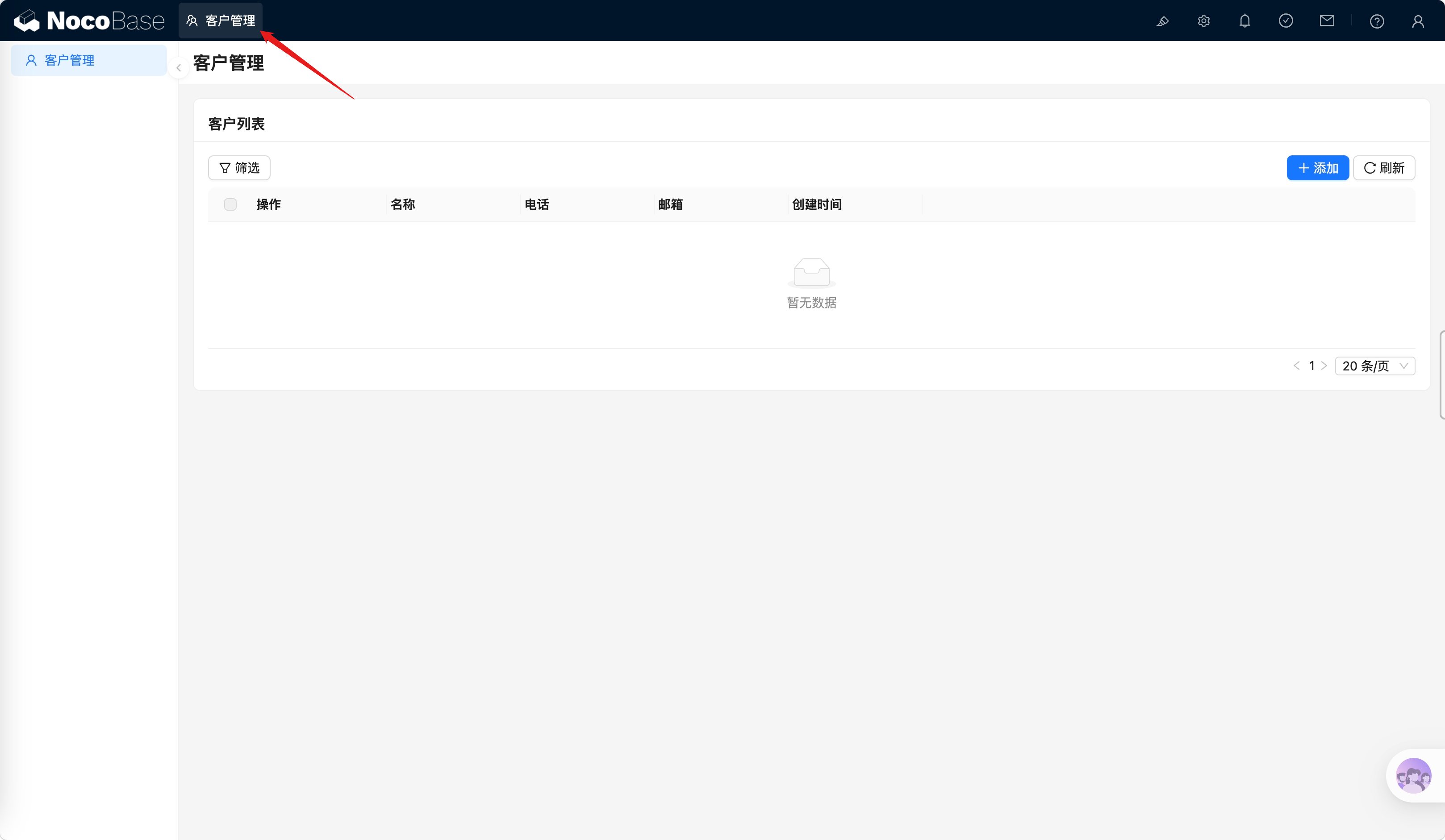帮我创建一个客户管理页面,包含姓名搜索框和客户表格,表格显示名称、电话、邮箱、创建时间,自动创建数据表,除 ID 外其他字段都要使用中文标题。